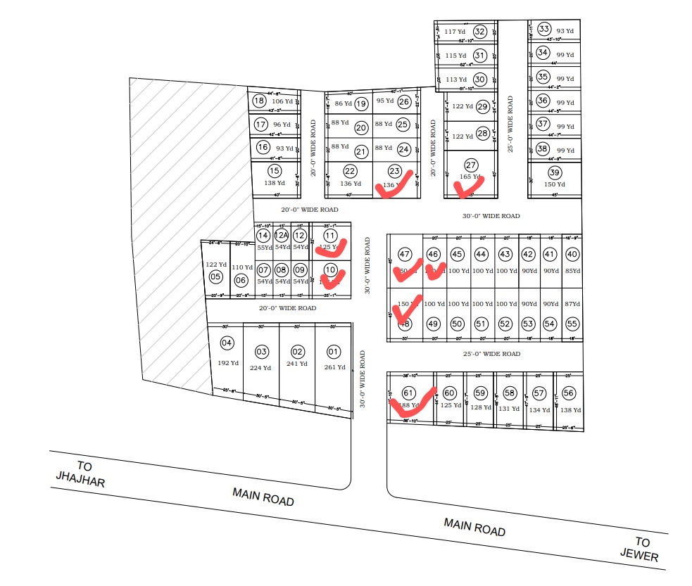Our project, Jewar Residency, offers premium plots in Jewar and is located near Kailash Hospital, Jewar, the Jewar ITI Institute, and just behind the Jewar District Court. It is a 14-acre gated township/society, and we have already sold more than 50% of the plots, successfully completing more than 40 registries for customer plots. Our plots range in size from 100 square yards to 1000 square yards.